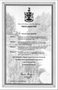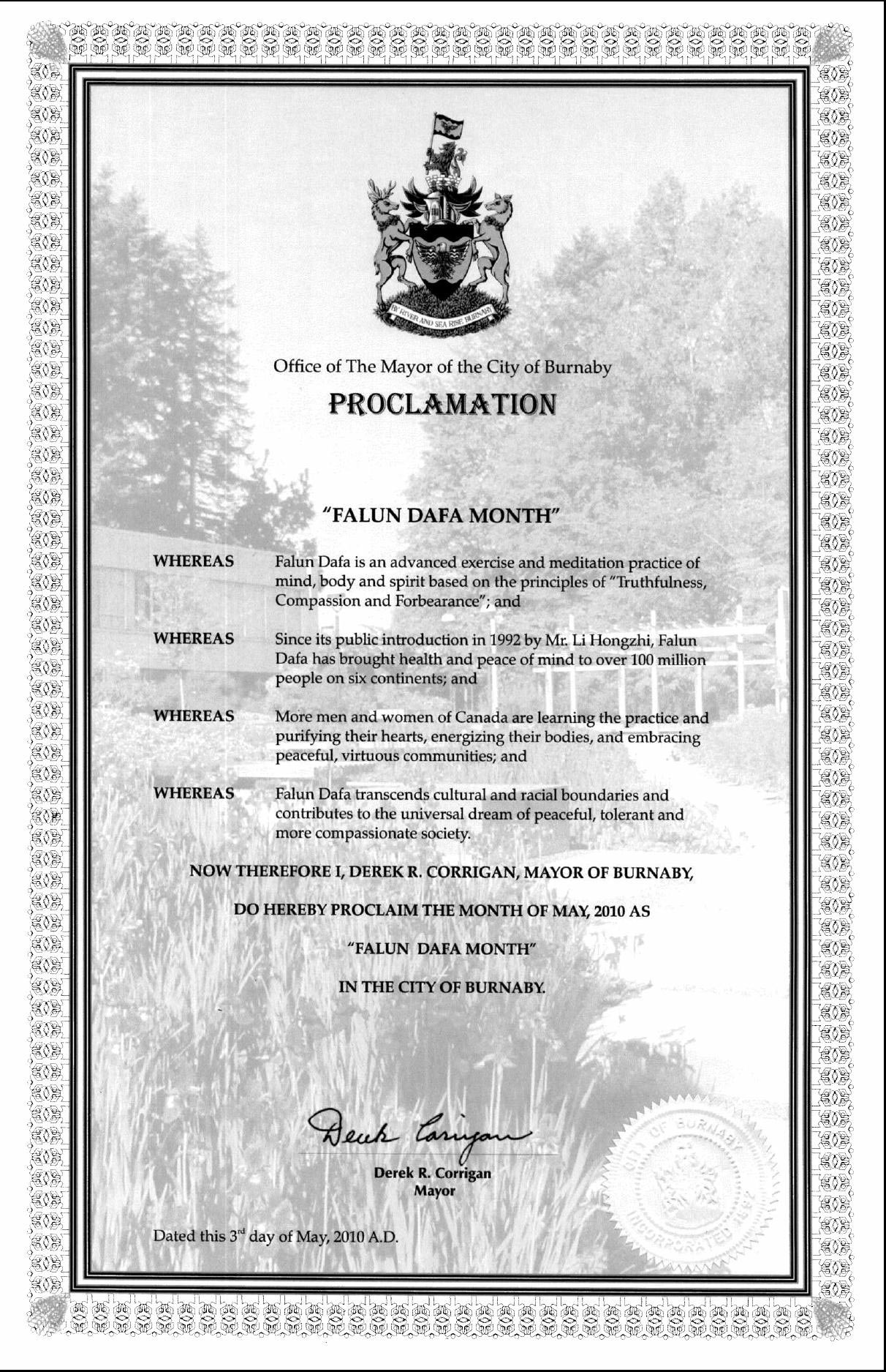 鉴此,我,本拿比市市长德里克•科里根(Derek R. Corrigan),特此褒奖二零一零年五月为本拿比市“法轮大法月”。