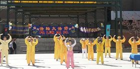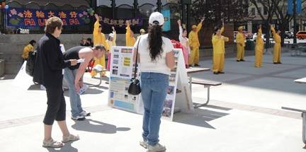 最后,学员们集体炼功。宁静祥和的炼功场面和悠扬的音乐声吸引了很多过往的行人。他们仔细阅读展板,自己拿取资料。一位西人女士了解真相后,握住学员的手说,“你知道你们又多了一个支持者。”
