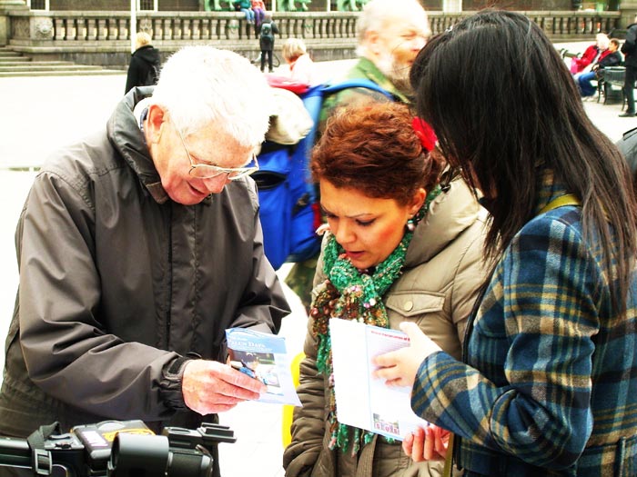 善良纯朴的丹麦人对法轮功的功法和“真、善、忍”的理念非常赞赏。一位丹麦人认真倾听了法轮功学员的介绍,并提出了有关修炼的问题,他当场表示要学习法轮功,并购买了一本丹麦文的《转法轮》。另一位年轻的丹麦女子认真阅读了真相图片,她来到学员鲍尔的面前希望得到更多的法轮功信息,并记下联系方式。