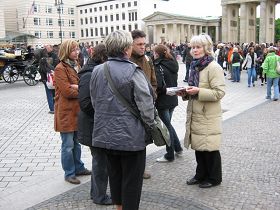 ![]() 在柏林著名景点博兰登堡门前,人们纷纷在法轮功展位上签名谴责中共迫害法轮功 |