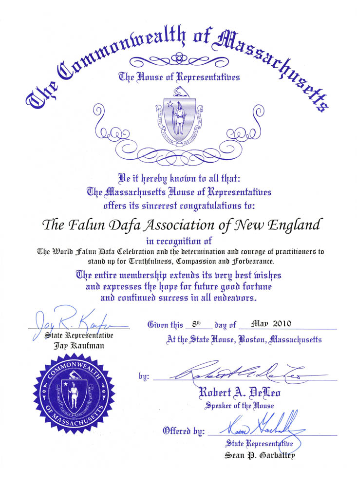 麻萨诸塞州众议院向新英格兰法轮大法学会致以最衷心的祝愿!