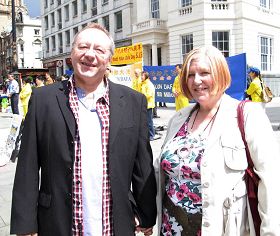 庆祝法轮大法日的活动吸引很多过往民众驻足观看,有不少人表示自己以前没听说过法轮功。但他们从接过的传单、真相展板或者和法轮功学员交谈中了解真相后都毫不迟疑地在反迫害征签表上签名,他们当中包括来自英国埃塞克斯的凯西•莱姆和贝尔•莱姆夫妇(Mrs Cathy Lamb & Mr Bell Lamb)。