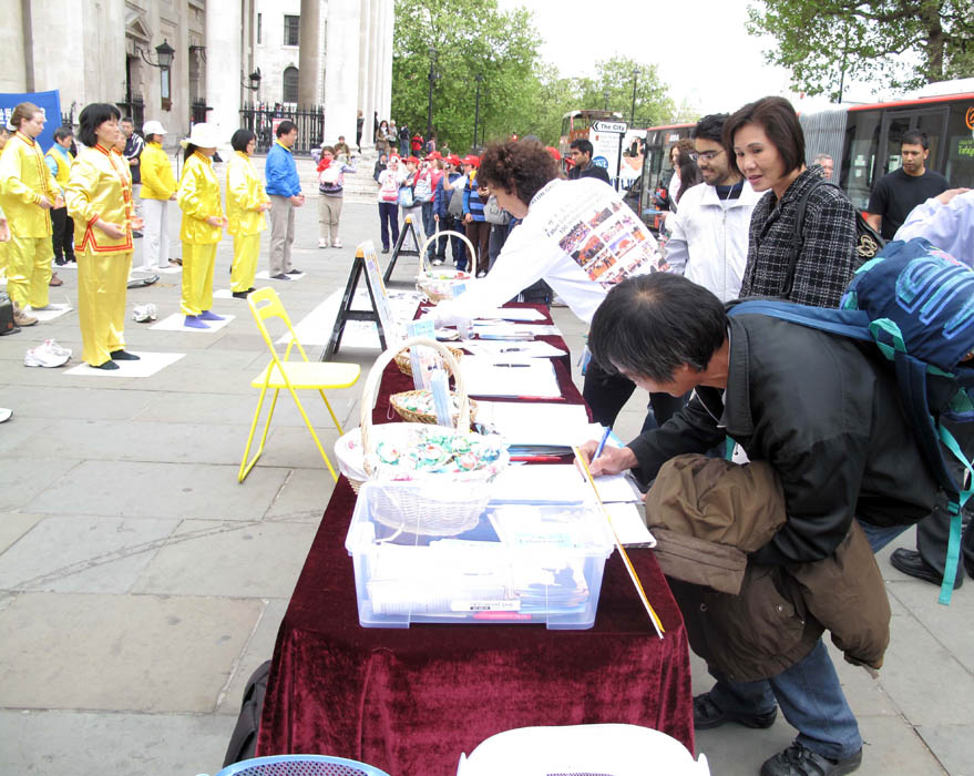 庆祝活动进行了一整天,法轮功学员们轮流向人们展示法轮功五套功法。祥和的炼功音乐在伦敦都市的喧嚣繁杂中听起来宛若天音,金黄色的炼功服在阳光下耀眼生辉。学员们一直面带微笑向过往路人发放法轮功真相传单,不时地给那些驻足观看、愿意了解真相的人送上一朵手工莲花,并向他们面对面地讲真相。很多人在呼吁制止中共迫害法轮功的征签表上签字。