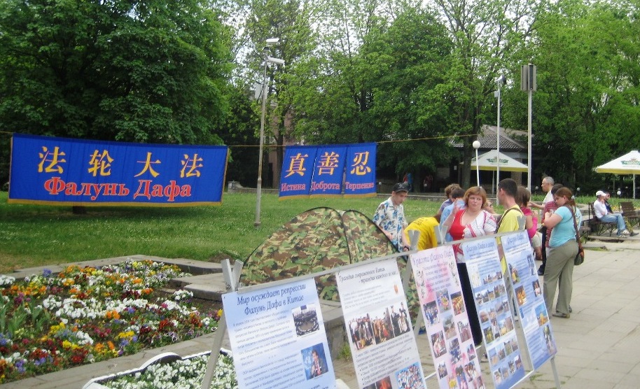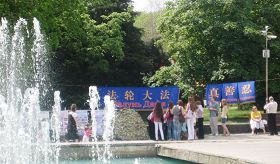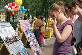 五月十五日,圣彼得堡法轮功学员又来到市中心公园,在那里举行了庆祝活动。学员们打起腰鼓,载歌载舞,庆祝节日。此外,他们还摆出展板,向人们介绍法轮大法的信息,揭露中共如何残酷迫害法轮功。