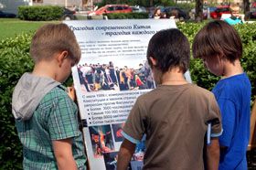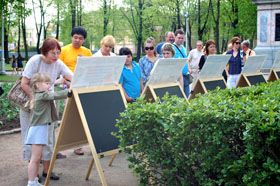 ![]() 在圣彼得堡市中心公园,人们认真阅读法轮功真相展板 |