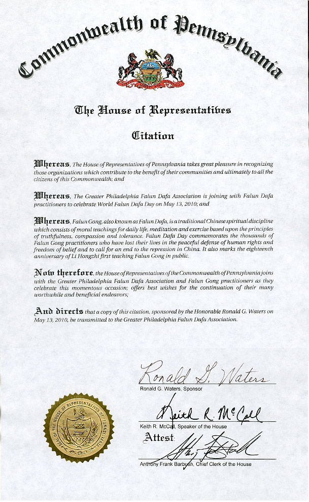 并决定将由令人尊敬的倡导人罗纳德.沃特斯议员(Honorable Ronald Waters)在二零一零年五月十三日将这封褒扬信传送给大费城地区法轮大法学会。