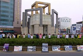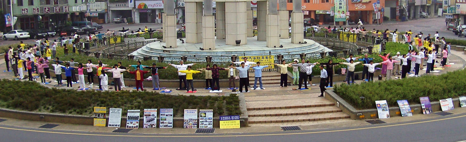 早晨四点五十分,学员在丽致伯爵饭店门前的圆环炼功,这里平日也是炼功点,早晚都有人在这里炼。晨曦微微,学员随着悠扬的乐音在圆环上静静地炼功。渐渐的,准备搭车出游的大陆游客,三五成群的在饭店前驻足观看。一些学员更在炼完功后,为坐在游览车上的大陆游客,展示讲述法轮功真相的看板。