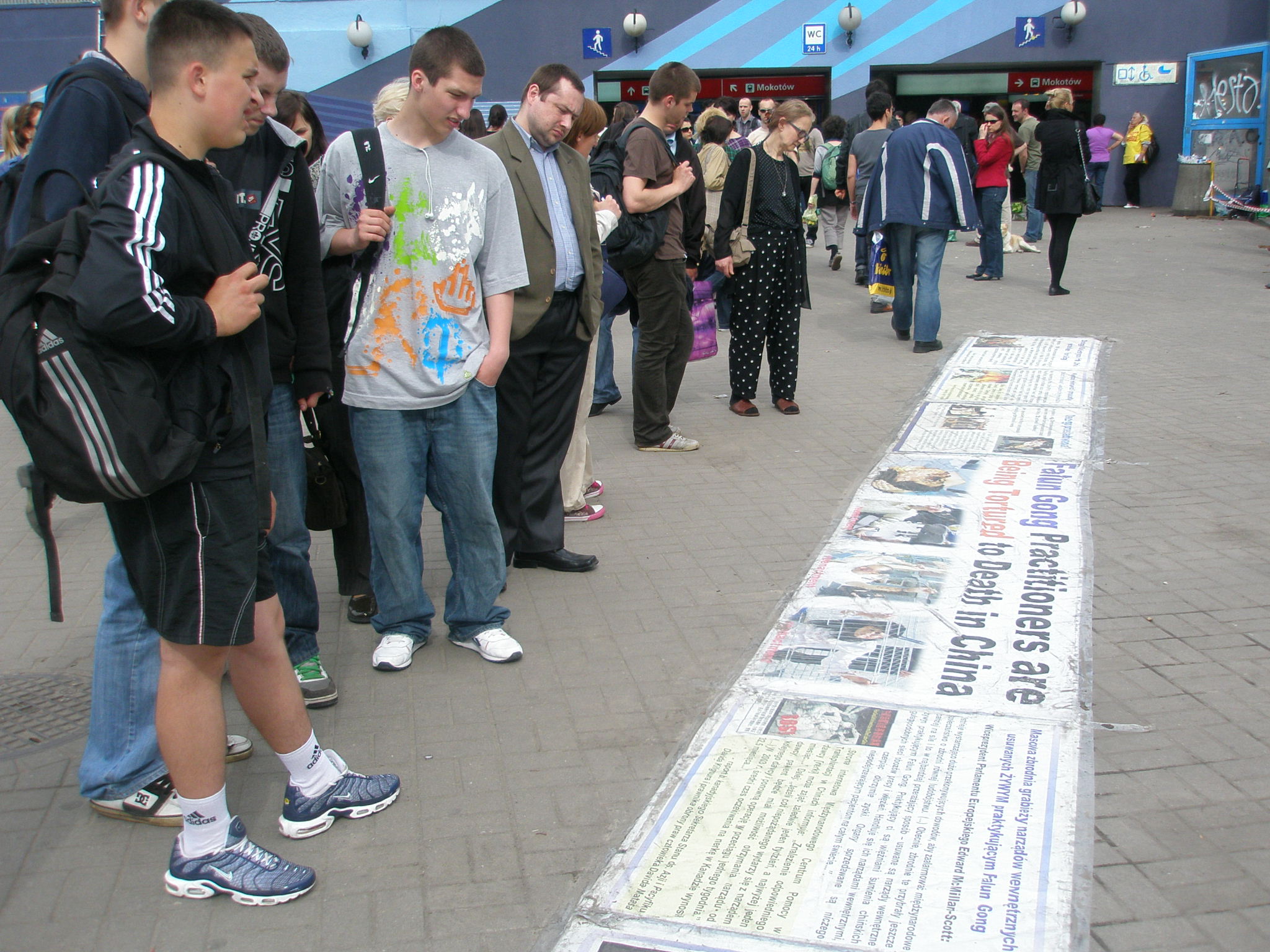 五月十三日清晨,法轮功学员们在华沙中心地铁站口和罗兹步行街上支起展板,向市民介绍法轮功在中国曾经七年内令亿万民众身心获益,以及十一年来无辜遭受到中共的残酷迫害。如今,大法依然根植中华大地,并迅速传播到世界一百多个国家和地区。