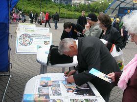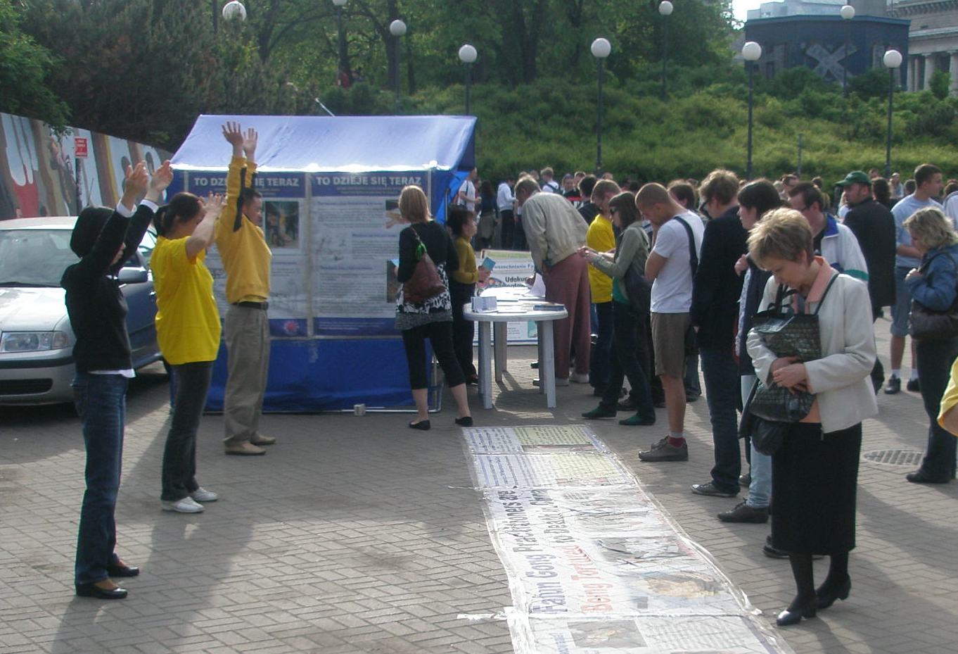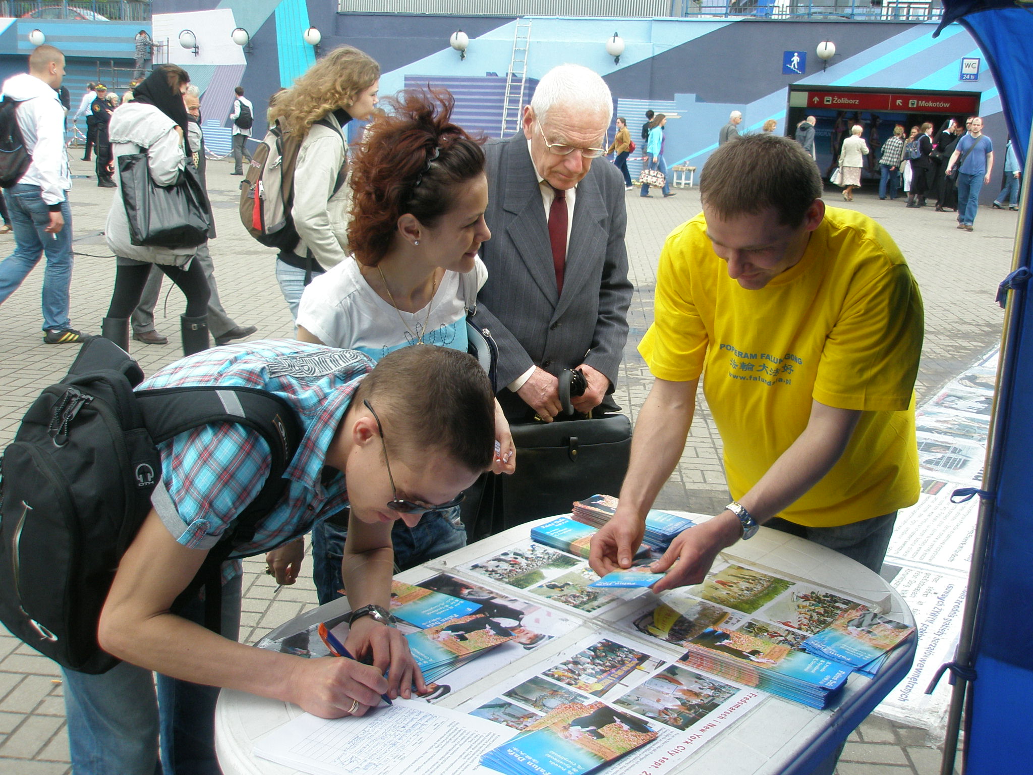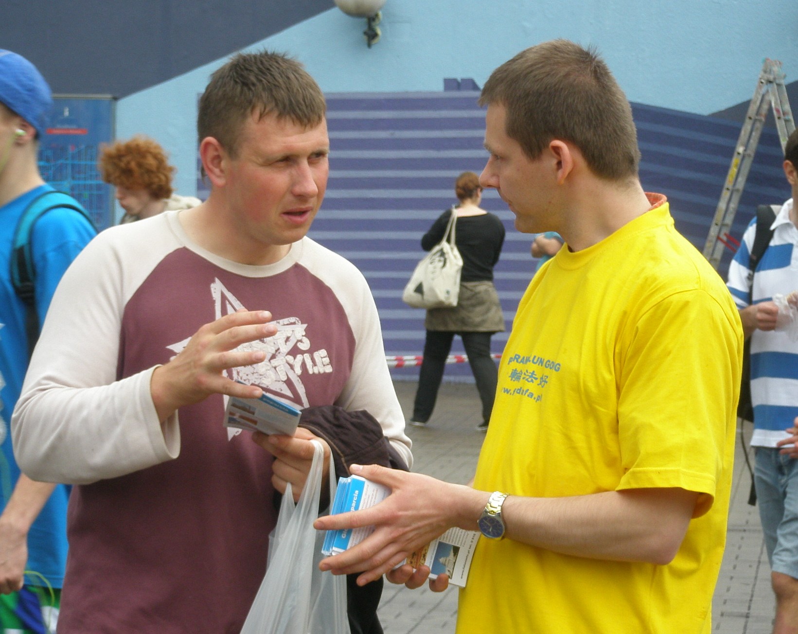 这一天,有很多波兰人不约而同来问《普度》《济世》音乐光碟,更多的波兰人对法轮大法产生了浓厚兴趣,与学员长时间交谈,询问,了解,甚至多次返回,希望知道再多一些。学员郑重向他们推荐《法轮功》和,告诉他(她)们,所有问题,书中都有答案,并欢迎大家参加集体炼功,当场有很多波兰人高高兴兴地报名参加。