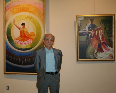 ![]() 八十六岁的高桥勝治先生在“真善忍国际美术展”上自己喜欢的作品前留念 |