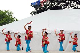 大费城明慧学校的学生应邀表演了莲花舞《插莲花》和腰鼓《法轮大法好》。音乐一响,《法轮大法好》响彻整个公园,仿佛空气都凝聚了,人们都在观看着孩子们的表演。腰鼓表演完,主持人赞叹道:“是不是非常美?”台下掌声一片:“是!”