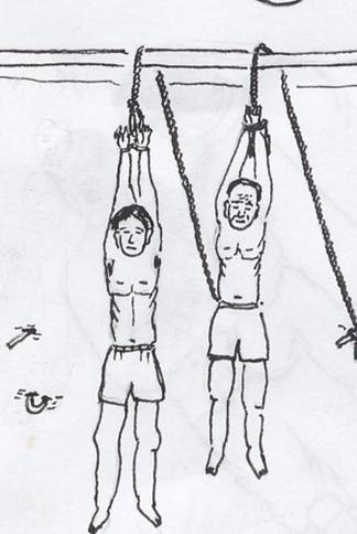 ![]() 吊铐酷刑图:学员双手被用细绳、手铐长时间吊起,受刑后手臂长时间不能活动,重者终身残废 |