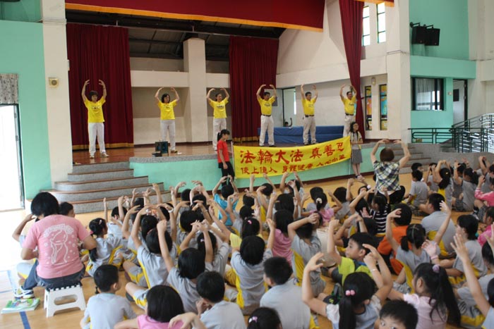 【明慧网二零一零年五月三十一日】二零一零年五月二十八日,法轮功学员受台湾高雄县蔡文国小李校长邀请,利用朝会二十分钟的时间,演示法轮五套功法及介绍功法的内涵,希望小朋友除读书学习外,透过学炼法轮功,身心更健康,学习更专注。