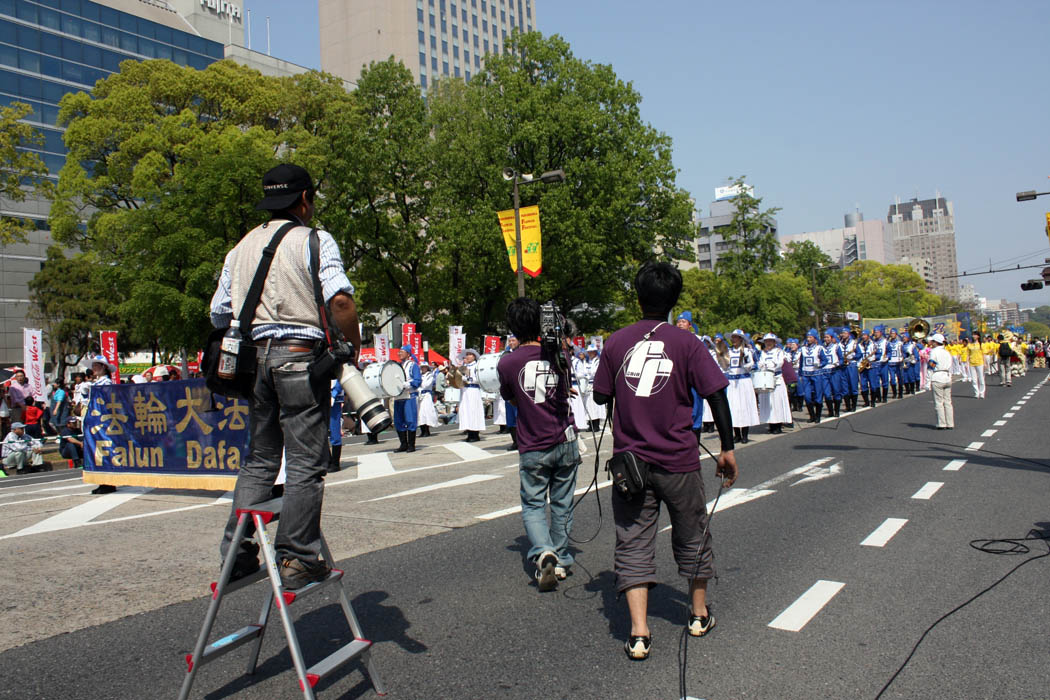 这时,大会组委会的广播里传来了播音员热情的声音:“请看!日本NPO法人法轮大法的队伍走过来了。法轮大法又称为法轮功,是中国传统的修炼方法,法轮功以‘真、善、忍’为修炼指导,作为身心健康的修炼方法广泛受到人们的爱戴。现在,世界上有一百多个国家有法轮功的修炼者。法轮功修炼者们,积极参与各种社区活动,致力于世界的友好与和平……”