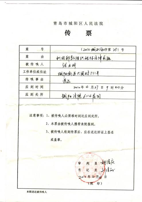 二十六日,他们从张玉珍老人家门缝塞進一份“青岛市城阳区人民法院”所谓的“传票”。上面的“应用处所”是“城阳法院6114房间”。审判员“胡绪庆”,书记员“刘佳丽”。