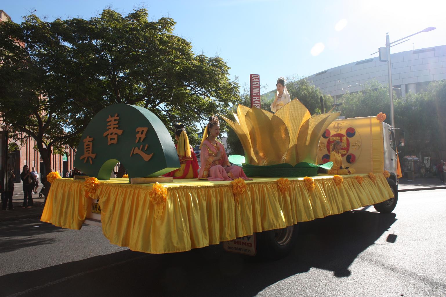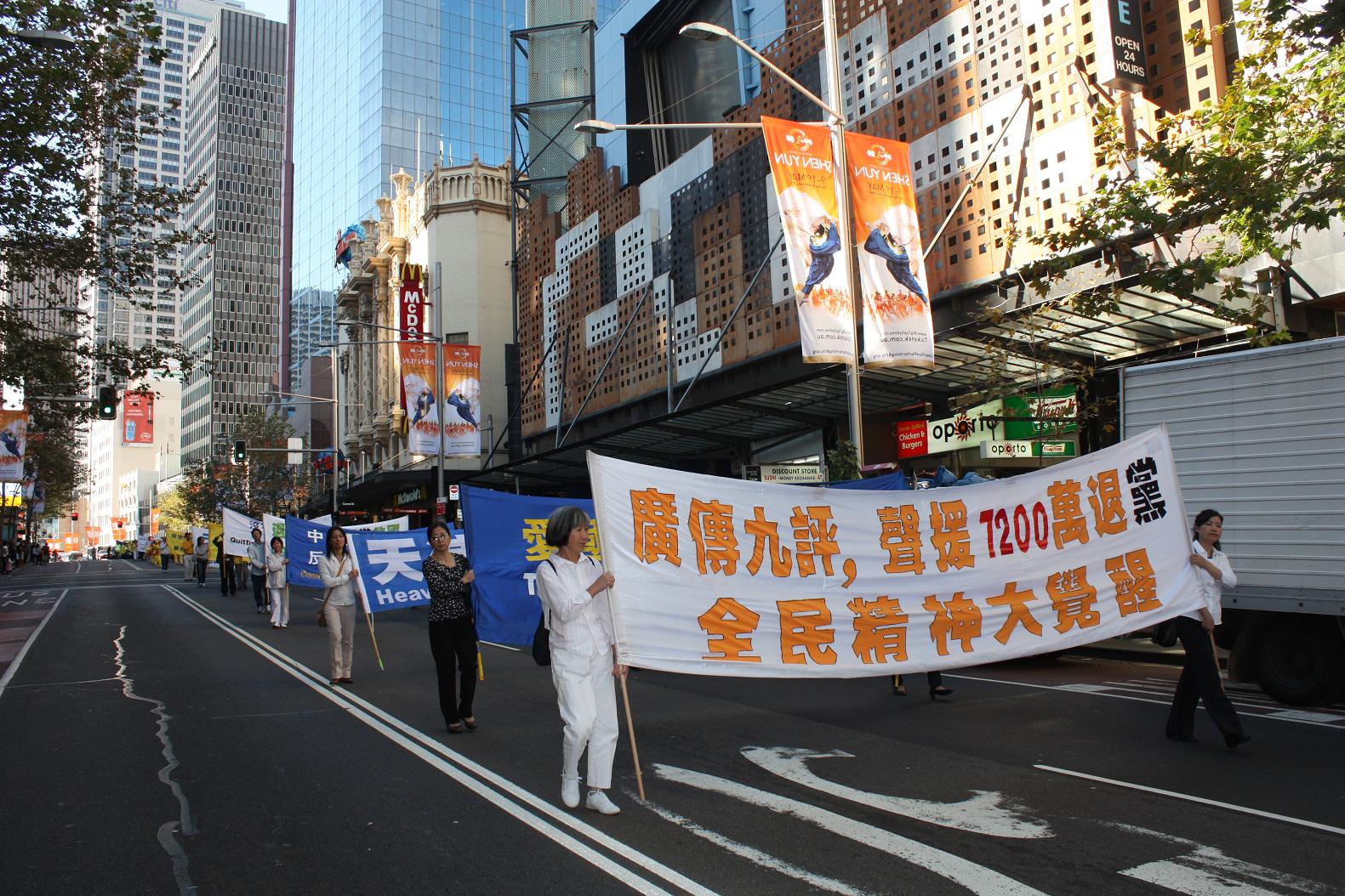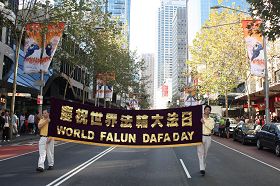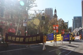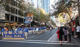 五月八日下午二点,悉尼的天空是晴空万里,蓝天白云,祥和又美好。悉尼法轮功学员们聚集在著名的市政厅广场,游行队伍从此地出发,路经繁华乔治主街,转向唐人街,到达悉尼娱乐中心。一路上行人们都纷纷驻足,惊讶地看着,并拿出手机抢拍游行场面。