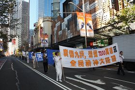 壮观的法轮大法天国乐团在游行队伍前打头阵,《法轮大法好》、《法正乾坤》等演奏曲响彻云霄,紧跟广传《·九·评*共产党》、促“三:退.”(退!党!、退*团-、退*队-)方阵,将全球三:退.大潮生动,形象化地表现了出来;随后则是揭露中共迫害法轮功的真相,一辆平板大卡车上的真人酷刑展将中共活体摘取法轮功学员器官牟利、这个星球上有史以来最邪恶的暴行揭露出来,并配备双语同声解说;最后一个方阵是腰鼓队,他们打着欢快的鼓点,使得每一个人都是精神抖擞,神采奕奕。