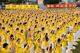 古人讲“滴水之恩,涌泉相报”,全体学员们也齐声向李老师道出最诚挚的“恭祝师尊生日快乐”。紧接着,全体学员大合唱两首曲子“师父啊,谢谢您”、“法轮大法好”,向伟大的李洪志老师表达最高的敬意。最后,大会在祥和的集体炼功中圆满结束。