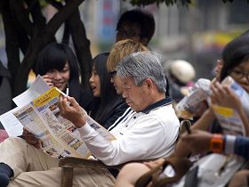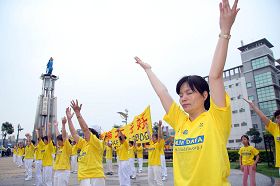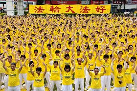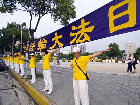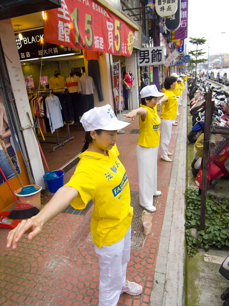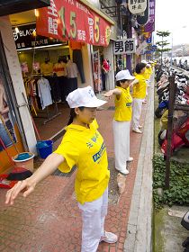 ![]() 学员在街道、广场以炼功、举展版、发资料等方式向民众传递真相 |