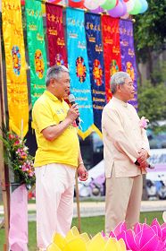 平镇市民代表叶姜双凤女士在致词中祝贺李洪志先生生日快乐,也希望能多向法轮功学员学习,表现出更慈悲祥和的一面。县议员徐景文先生则表示,法轮功弘传到台湾发扬光大,他每天早上在公园都会看到有人在炼功。他希望能象法轮功学员一样如此坚持,也希望这对社会好的功法能更进一步发扬光大。
