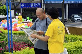 一位五十多岁左右的路人,在接受学员发给他的特刊后表示,他在电视上有看到法轮功的相关报导,他也常在旅游景点看到法轮功学员。他说“法轮功很好”,学员的形像不象中共宣传的那样,这么好的功法被中共打压,真是令人不解。