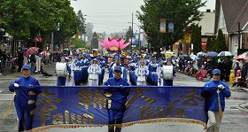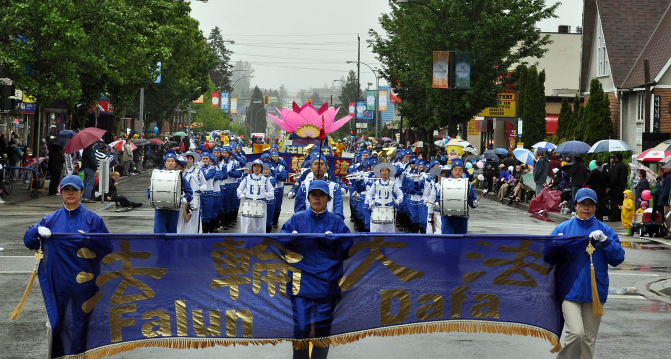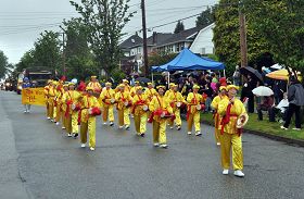 法轮功学员的队伍是大温哥华地区参加游行的一百二十五个社团中规模最大的团体。天国乐团、腰鼓队、花车等阵容在整个游行队伍中十分引人注目。天国乐团的精彩演奏和节奏明快的鼓点声令人耳目一新;老年腰鼓队的表演增加了传统的东方文化气息;花车上的功法演示及学员们散发的真相资料使人更多地了解了法轮功。