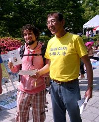 在活动的第二天,一位来自中国山东的留学生,他说是看到了法轮功的横幅特意来的,并说以前在国内,中共迫害法轮功之前,他曾有过一本《转法轮》的书。他问了许多有关法轮功的问题,学员都做了认真的回答并给他介绍了现在的“三:退.”(退出中共党、团、队)大潮。他说他是党员,在网上看过《·九·评*共产党》,但不是很仔细,问学员有没有《·九·评*》一书。一位学员把自己带的《·九·评*》一书送给了他。他表示回去后要好好看看。学员告诉他在大.纪.元;的网站上可以做三:退.,祝他好运。他表示感谢。
