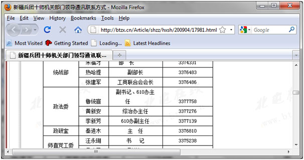 ![]() 新疆生产建设兵团第十师的通讯联系方式中列出其610办公室头目的名单(网络截图) |