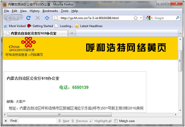 例一,内蒙古自治区呼和浩特网络黄页列出了内蒙古自治区公安厅610办公室的电话和地址(下图)。