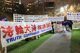 十九日是周六,下午四点后,刚刚举办过庆贺七千五百万勇士三:退.集会的法轮功学员来到柏悦大酒店前,法轮功学员在警察指定的地点打出“声援7500万退!党! 迎接全民觉醒”、“公开退!党! 解体中共”、“天灭中共 天佑中华”、“法轮大法好”等大型横幅。