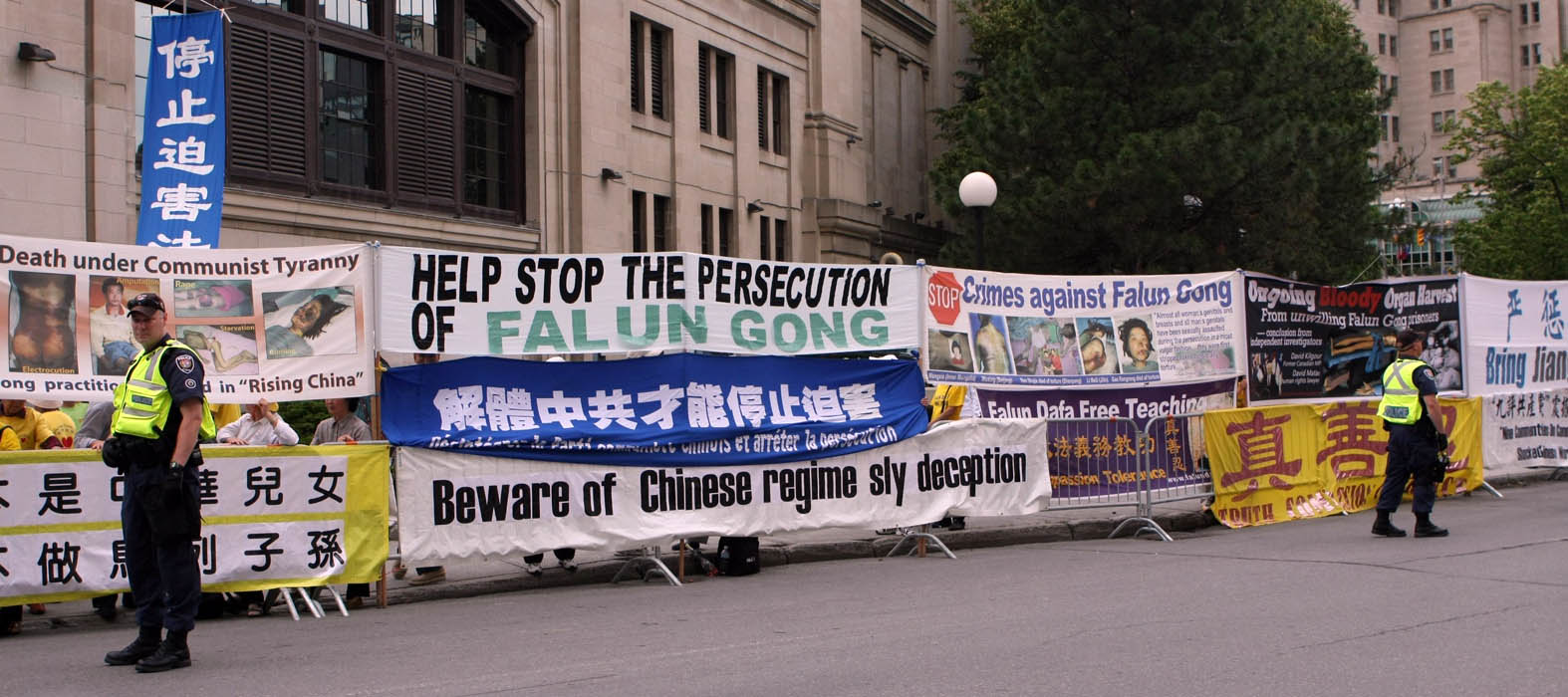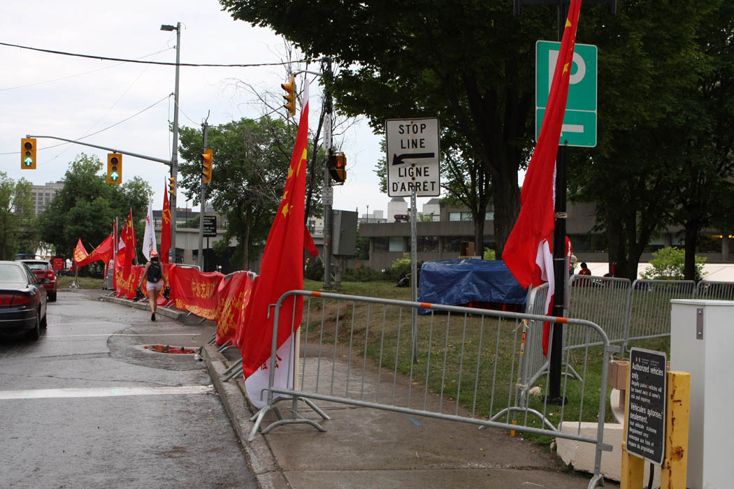 法轮功学员周立敏接受采访时说:“二十三号凌晨两点左右,旅馆前突然出现两百多名中国留学生、华人社团的人拿着红旗,要来覆盖我们的横幅。最终,他们的行为被加拿大警察制止。”