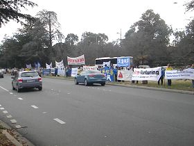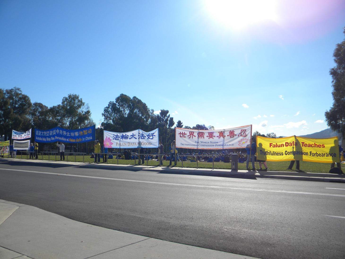 二十日下午,法轮功学员得知中共代表团可能在下午五点到达堪培拉机场。二点左右,他们就在几个主要路口拉好横幅静静等待,堪培拉警察在核实法轮功学员的身份与诉求后欣然应允他们表达诉求的权利。习*近*平的专机于三点四十五分提早到达机场,不知他们是否是为了避免正面遭遇法轮功学员的抗议而选择了从机场后门出来,但仍然无可回避地遇到在后门等待已久的法轮功学员的抗议。在其前往凯悦酒店的路上,法轮功学员也沿途陆续打出“法轮大法好”“天灭中共”等条幅,让这个代表团的每个成员感受到民主国家的不同。