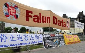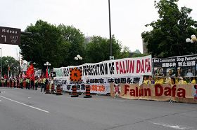 ![]() 法轮功学员在加拿大国会山前打出谴责中共迫害的横幅 |