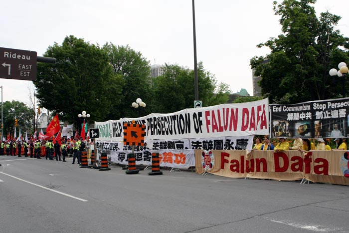法轮功学员抗议时秩序井然,现场的皇家骑警对法轮功学员说:“做得好!你们很合作。”在法轮功学员将要离开时,皇家骑警对法轮功学员的配合表示感谢。