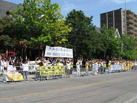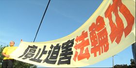 二十五日下午五点十一分,当胡一行的车队刚抵达多伦多,行驶在高速公路上时,就看见了在公路两侧法轮功学员高高举着的“停止迫害法轮功”的横幅。