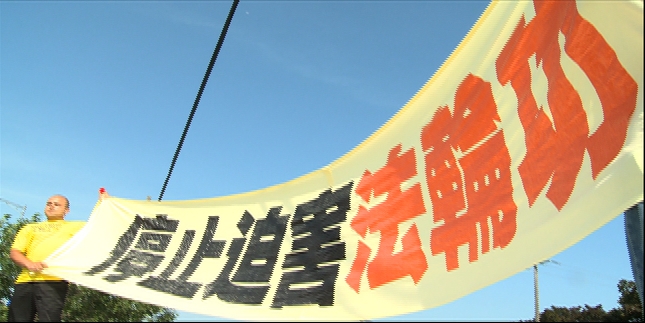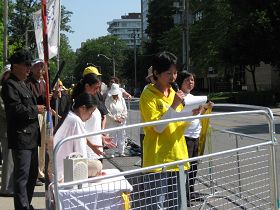 法轮功学员宋宇飞发言说:“今天我们站在这里集会,在中共的首脑到访加拿大之前,强烈要求中共政权立刻停止对法轮功长达十一年的迫害,立刻停止这人类历史上最大的罪恶。”