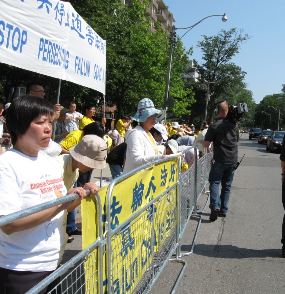 多伦多法轮大法学会会长说:“我们在海外这十一年来,一直是在中领馆前,和平呼吁制止中共当局迫害法轮功。今天我们选择在这个地方,也是同样地让胡锦涛和来访的中共官员能够听到的和看到法轮功的真实情况,停止迫害法轮功。最近我们得到各界民众的支持,已收到四万五千多个给加拿大总理的签名,呼吁他帮助制止迫害法轮功。”他表示,胡锦涛在多伦多停留期间,法轮功学员每天都会在中领馆前和平抗议。