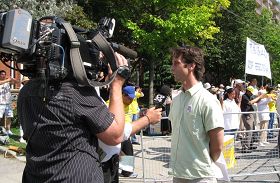 法轮功学员的和平抗议活动首先是两点三十分在中领馆对面举行。与前几天一样,学员在舒缓的音乐中炼功,和展出反对酷刑的演示。静静地表达他们的诉求。下午三点三十分,召开了新闻发布会,多伦多多家媒体做了采访,主流媒体的CP24电视台做了现场直播。几名身着黄背心的警察只是偶尔指挥一下交通,看不出一点紧张。