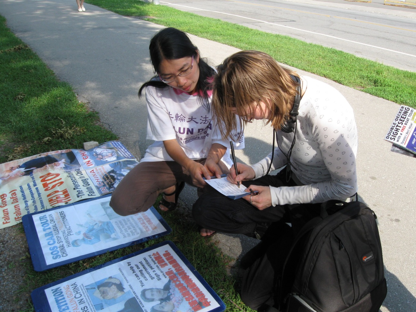 在多伦多大学就读的大学生安格拉(Angola)签完名后对记者说:“我都记不清有多少年了,我基本上是每天都看到法轮功学员在中领馆前的和平抗议,因为我就住在中领馆的附近。他们只是在炼功和打坐,很平和,为什么要迫害这么一群人呢?还持续了这么久,该结束了,希望所有的人都能来制止这场迫害。”