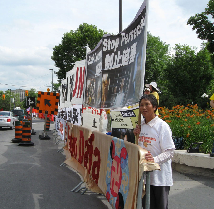 渥太华法轮功学员石女士早上到了威斯汀旅馆挂横幅的现场,看到一帮年轻的学生用红旗盖横幅,她就带着救他们的心对待他们。