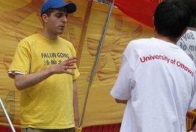 来自多伦多的法轮功学员李女士几天前就已到渥太华参加了揭露中共迫害的“模拟酷刑展”活动,二十二日半夜得知旅馆前横幅被强行遮盖的消息,连夜赶来支援。面对被中共雇来的华人和学生,她耐心地给他们讲真相,对方个个都非常高兴地离开了。