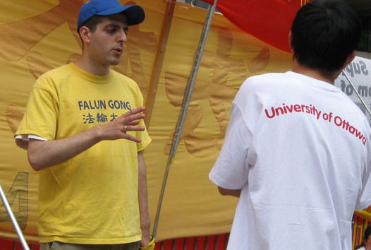 她介绍说,一位渥太华大学的半工读生,听完了法轮功真相和退!党!保平安的好处后,他说明白了真相后感觉很舒服,同意用“谢平”两字做了三:退.。他还说:“我现在才知道你们是真正地在救人。”并要求要与周女士合影留念,还表示回去后要读《转法轮》。