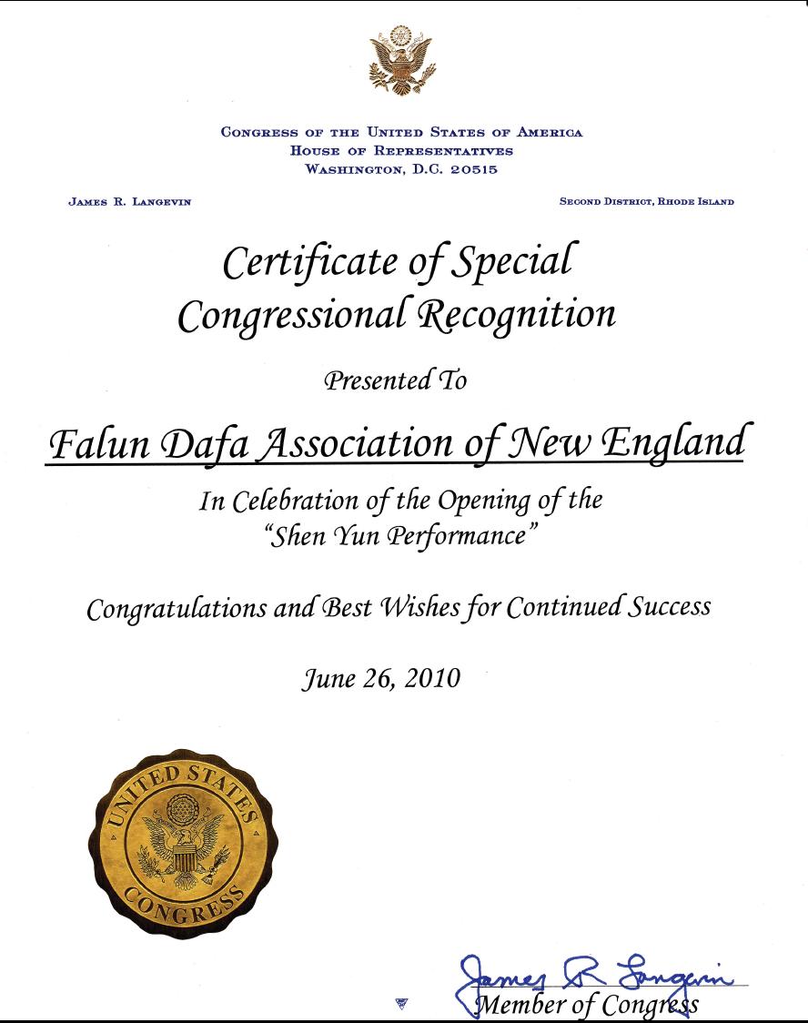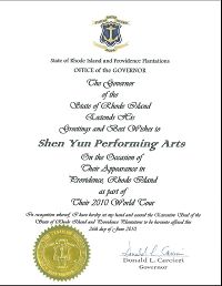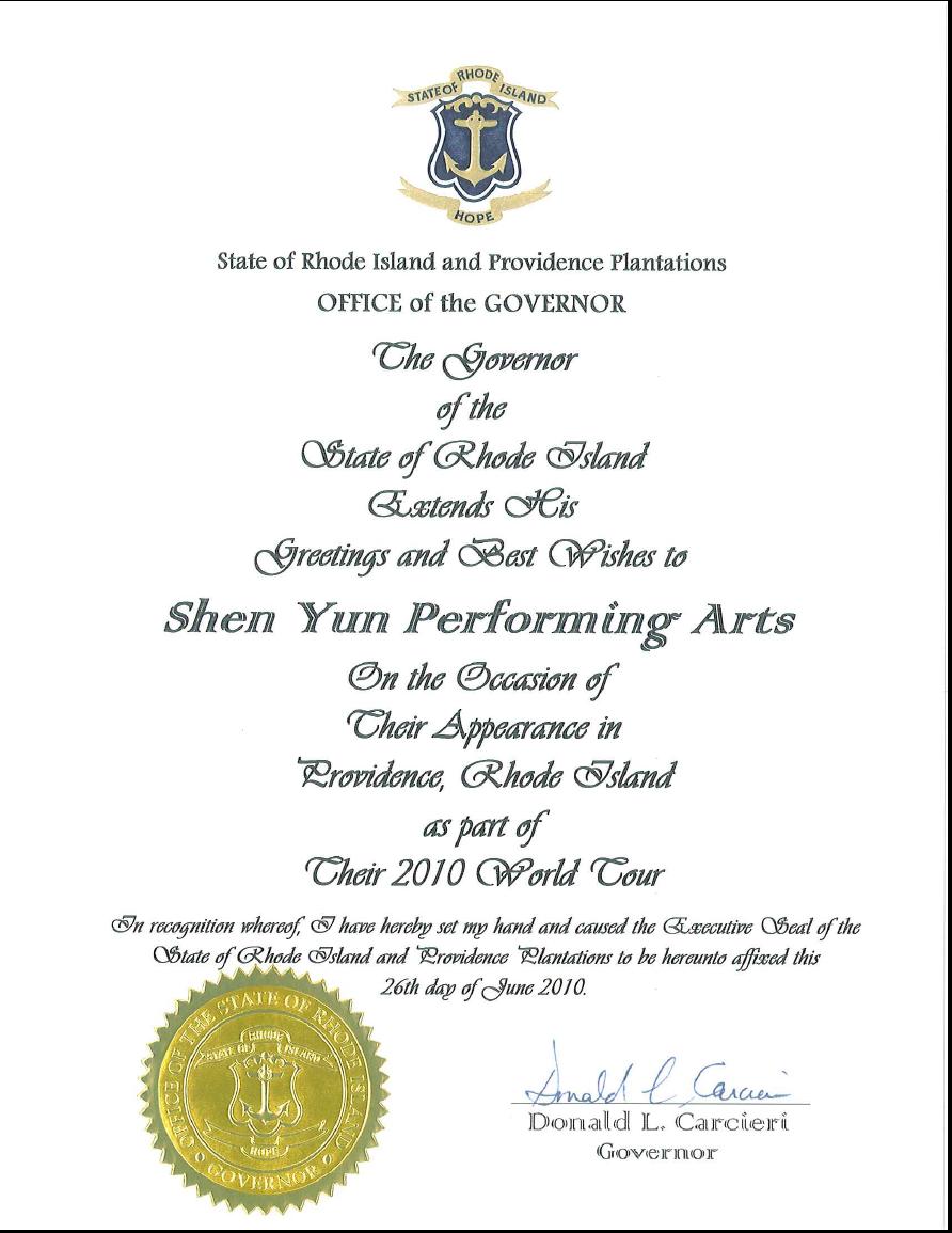 罗德岛州州长对神韵艺术团二零一零年世界巡回中能莅临罗德岛州演出,致以最美好的祝愿与欢迎。