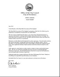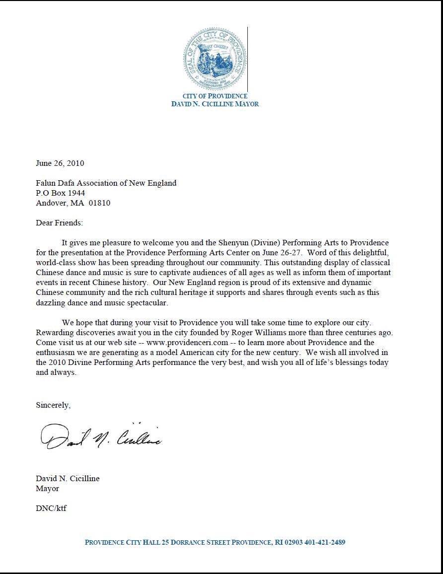 我非常荣幸欢迎神韵艺术团光临普罗维登斯市。新英格兰地区法轮大法学会主办的神韵晚会将于六月二十六日、二十七日在普罗维登斯表演艺术中心进行演出。这个举世瞩目的古典中国舞蹈音乐演出毫无疑问会吸引所有年龄层的观众。我们新英格兰地区为有这样延展繁荣的中国社区,以及她所支持和分享的丰富文化承传而自豪。