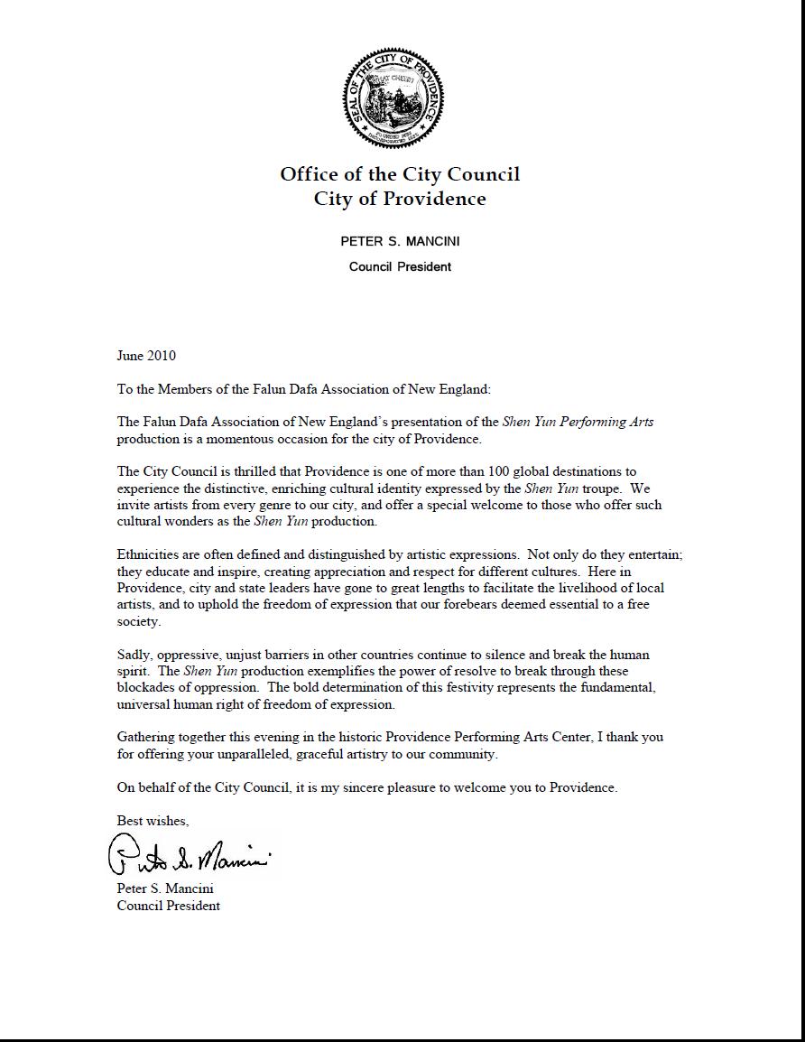 市议会对普罗维登斯市能成为这个非同寻常的、富有文化特色的神韵艺术团在全球一百多个城市演出之一的城市而感兴奋。我们经常邀请不同的艺术家到我们城市演出,尤为欢迎象神韵艺术团这样展现文化奇观的表演。