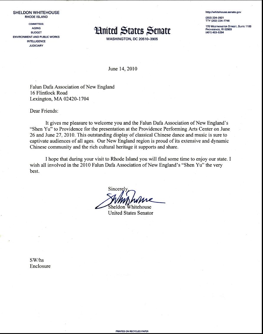 作为代表罗德岛州的参议员,我热切欢迎所有参加普罗维登斯表演艺术中心的神韵艺术团成员。