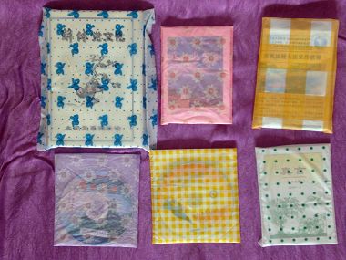我是从门市部买的每包10张的台桌塑布,花色选用小花而清淡色的。如:淡黄、淡蓝、淡紫、淡粉。制成的包装袋,美观、大方、温馨。每张合1元。做好后的小册子、光盘袋等每个成本只有2――3分钱,《·九·评*》包装袋每个4――5分钱。