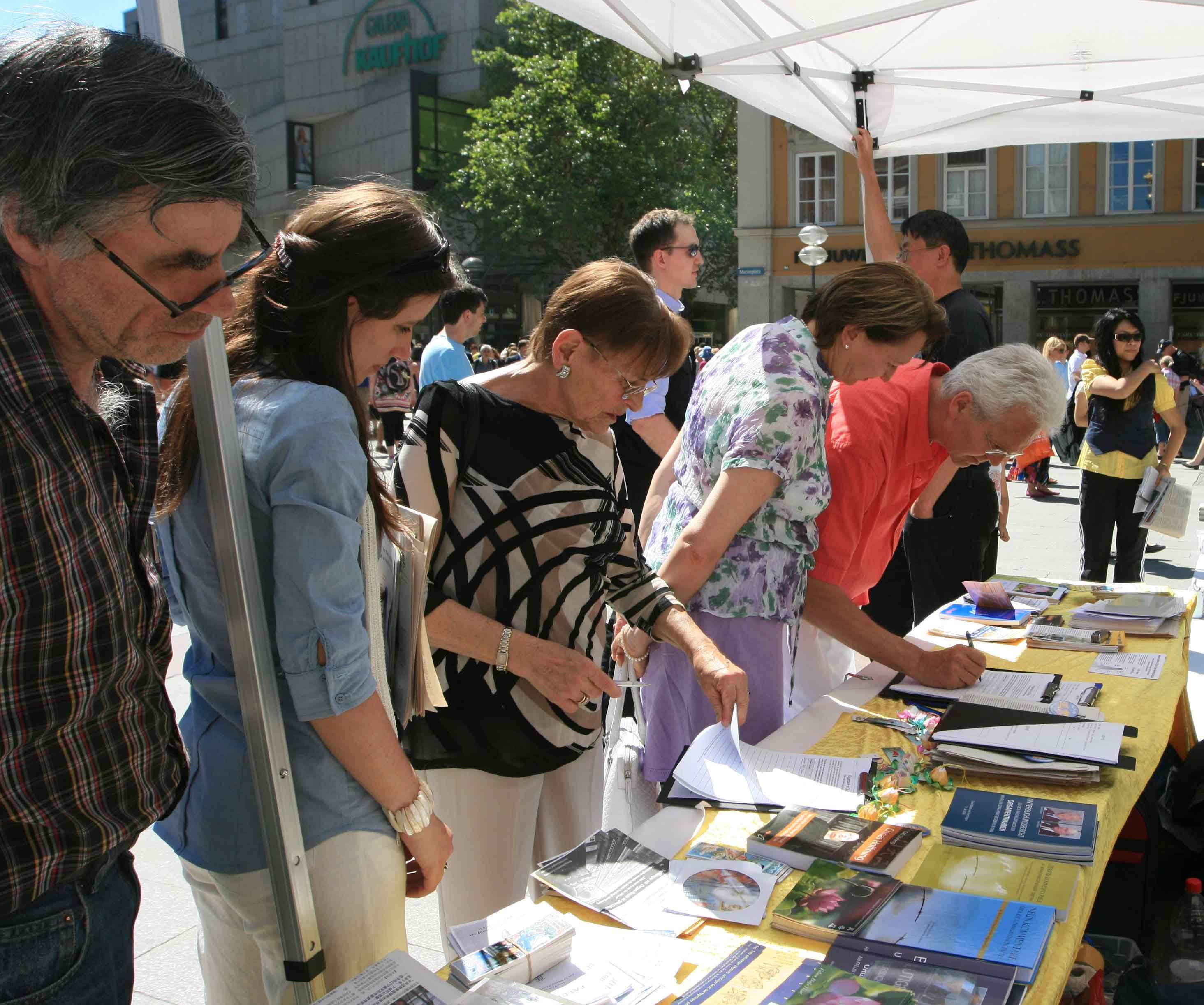 罗珀尔德女士看到的是一群法轮功学员,他们正在德国南部最大城市慕尼黑举办揭露中共迫害法轮功的活动,并演示法轮功祥和舒缓的五套功法。活动吸引了很多过往民众及旅游者的目光,人们观看揭露中共迫害法轮功的图片,在信息台前与学员交流,了解为什么法轮功会在中国被迫害。当人们得知中共是因为容不下“真、善、忍”的存在,而开始对法轮功进行迫害的时候,都感到不可思议。