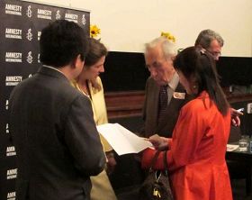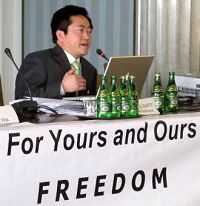全球.退:党!服务中心副主席易蓉女士发言介绍了正在中国发生的普通民众的精神觉醒运动,自从二零零四年底,《·九·评*共产党》系列社论问世以来,已有七千四百多万人自愿退出中共党团队及相关组织,对于中国以后的命运影响意义深远。随后,法轮功学员又向波兰第一任民选总理泰狄士•马佐维耶茨基(Tadeusz Mazowiecki)做了详细介绍。