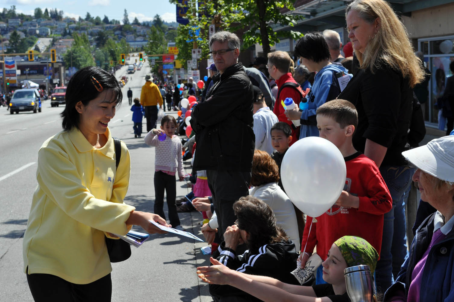 法轮功天国乐团的游行队伍和学员派发的真相资料使更多的人们了解了法轮大法的美好和在大陆发生的对法轮功学员的迫害。